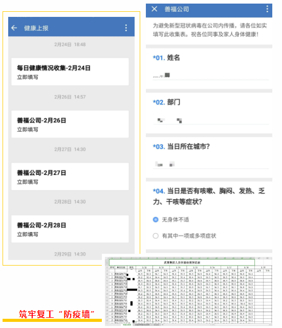 “復工任務雖急,人員安全更重,必須把好人員進場第一關。”在人員進場管控上,武重集團建立了這樣一條“硬核規定”:員工必須每天通過企業微信提交體溫信息,建立員工健康檔案,筑牢復工“防疫墻”。